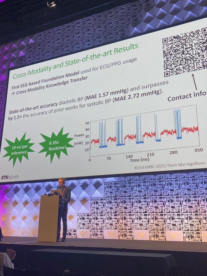 EMBC 2025 experimented with “silent disco” technical sessions—headphones on, presentations streamed like a live podcast. I introduced our finetuning and quantisation pipeline for EEG foundation models on ECG/PPG blood-pressure estimation, while Anna Tegon showcased FEMBA. Together we highlighted how BioFoundation unifies multi-modality biosignal learning.